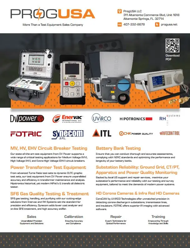 Since 2005 ProgUSA LLC has been bringing Quality Test Equipment to the USA Power Industry. Our technical sales team educates on new diagnostic techniques and advises on the best test sets for the application and the need. We offer technical seminars, demonstrations on site with reference to case studies and application notes. We provide fix-it service and calibration from our Florida service center on all products we have sold. We're here to help you get the most out of every test.